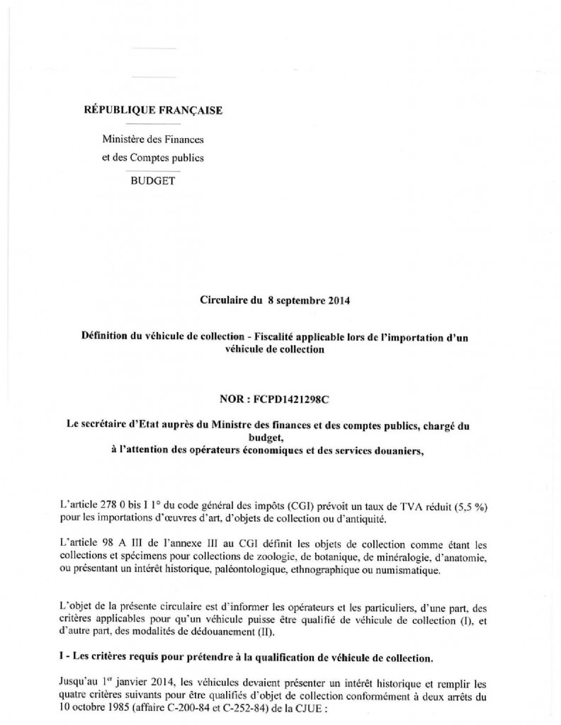 Pour l’application de l’exonération d’ISF prévue à l’article 885 I du CGI, les véhicules de collection s’entendent, à compter du 1er janvier 2015, de ceux définis par la circulaire douanière du 8 septembre 2014 (texte 14-028 : BOD 7032 => Circulaire du 8 Septembre 2014 jointe ci-après).